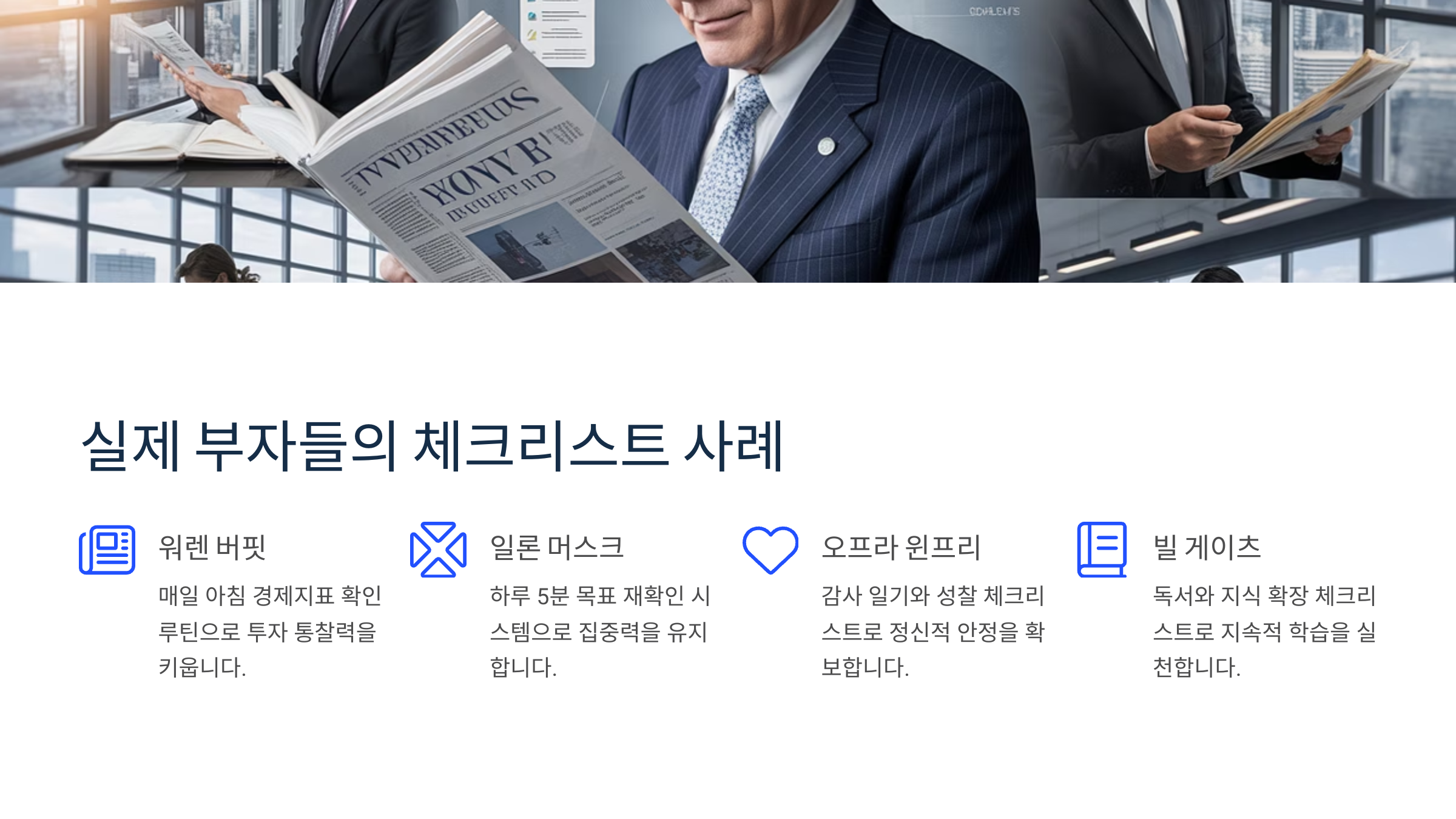 이처럼 부자들은 실수를 줄이고 결과를 예측 가능한 구조로 바꾸기 위해 ‘반복 가능한 시스템’을 구축해요. 그 기초가 되는 게 체크리스트랍니다.