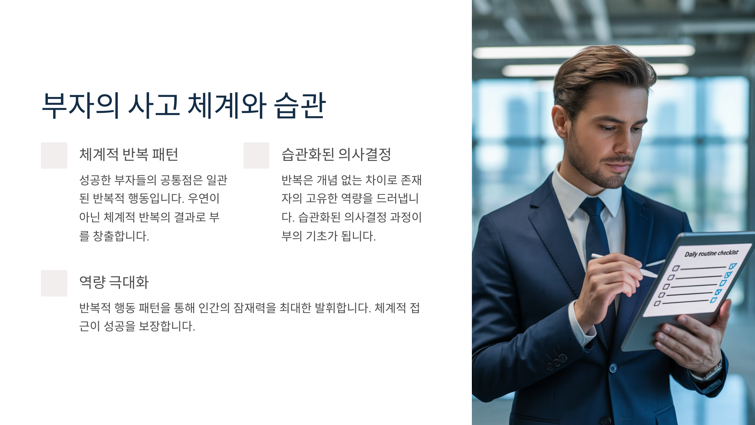 부자들의 공통된 특징 중 하나는 '사고 체계의 명확성'이에요. 감정이나 충동이 아니라 시스템으로 움직인다는 거죠.