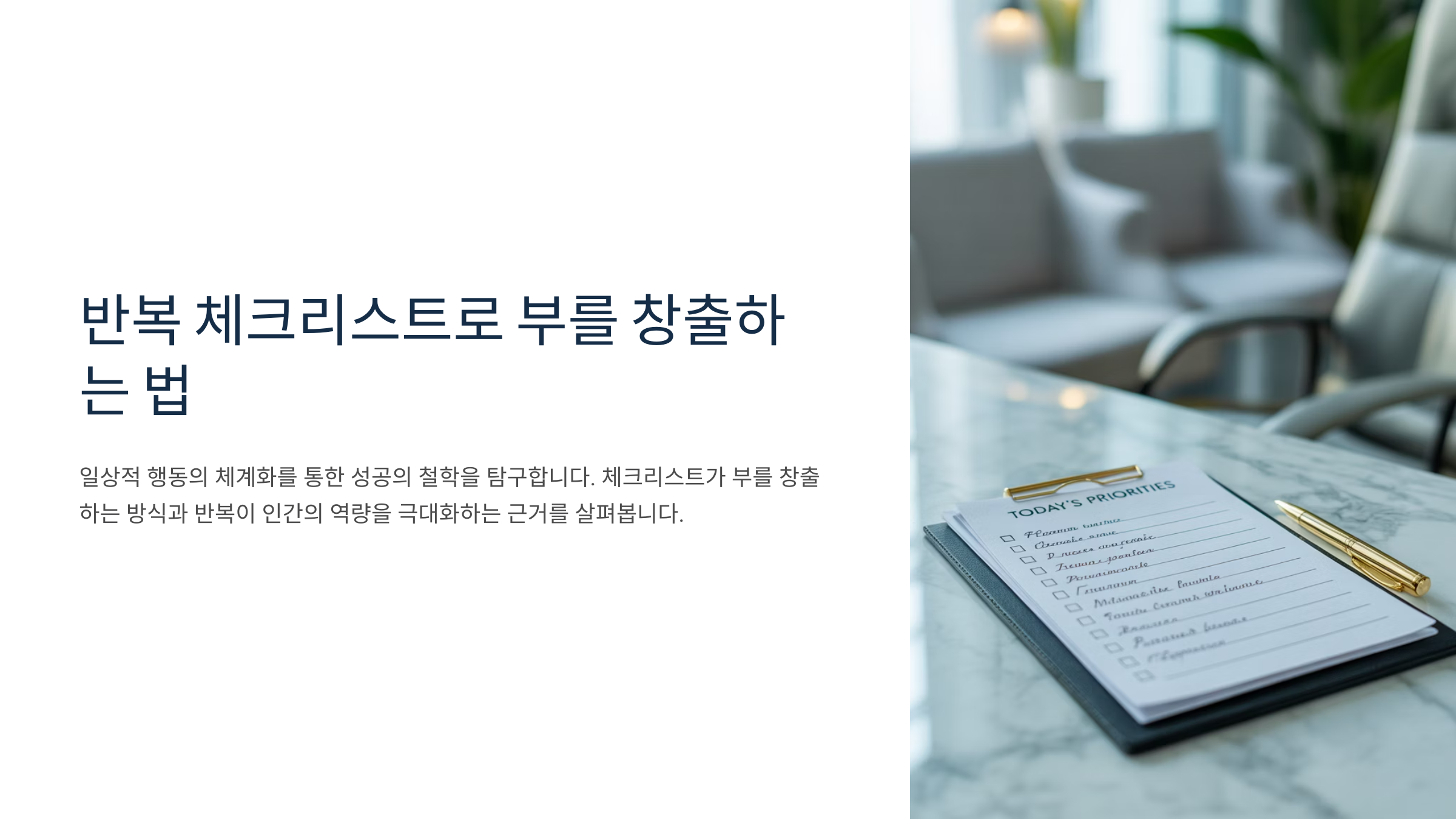 부자들은 의사결정에서 오는 피로를 줄이기 위해 수많은 루틴을 만듭니다. 그 루틴의 시작점이 바로 체크리스트죠. 매일 반복되는 결정들을 리스트로 고정시키면, 에너지를 절약하면서도 성공 확률은 높아져요.