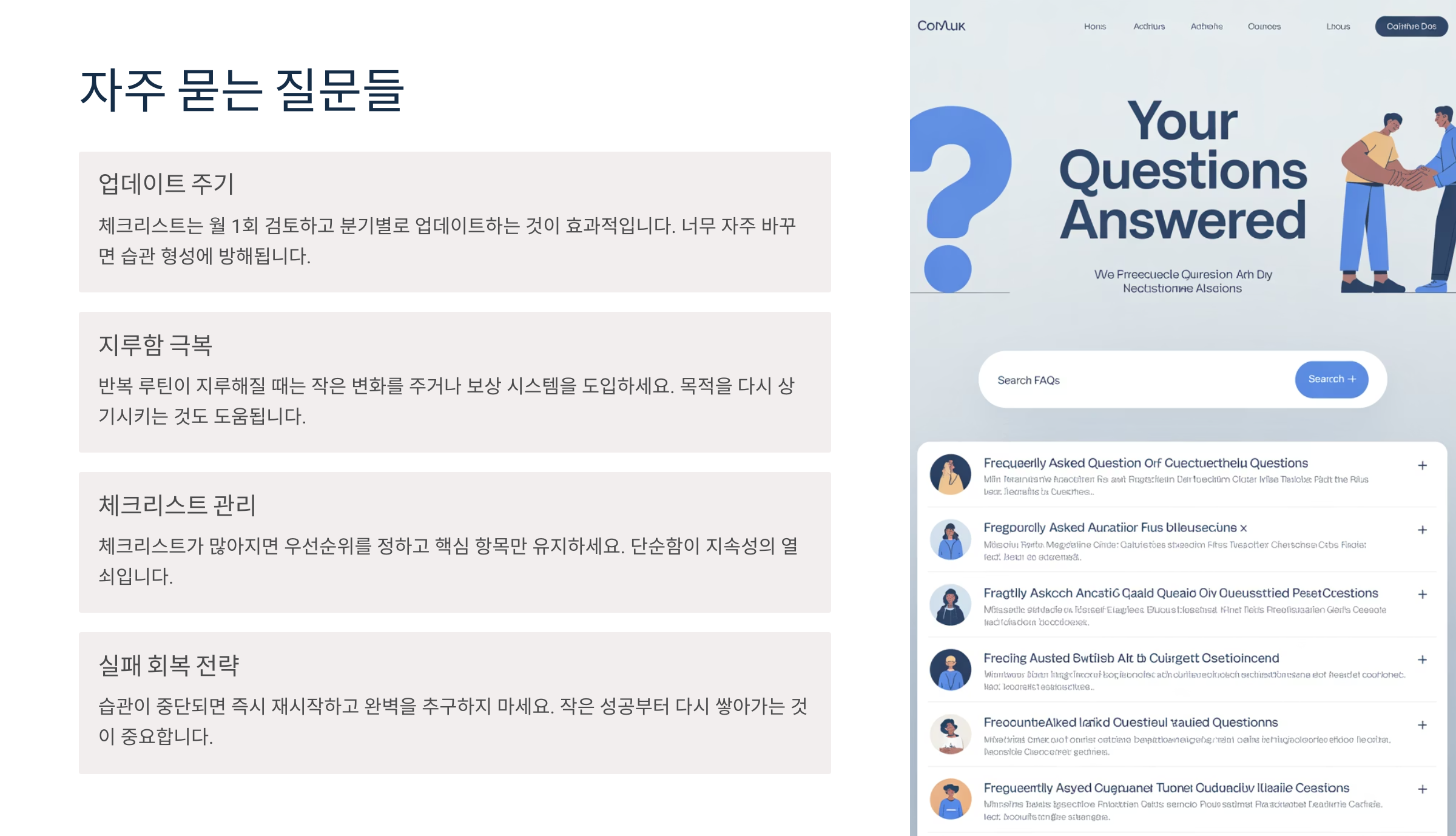 셋째, 매달 첫 주나 마지막 날 정기적으로 리뷰하는 시간을 꼭 확보하세요. 이게 체크리스트의 생명력이랍니다.