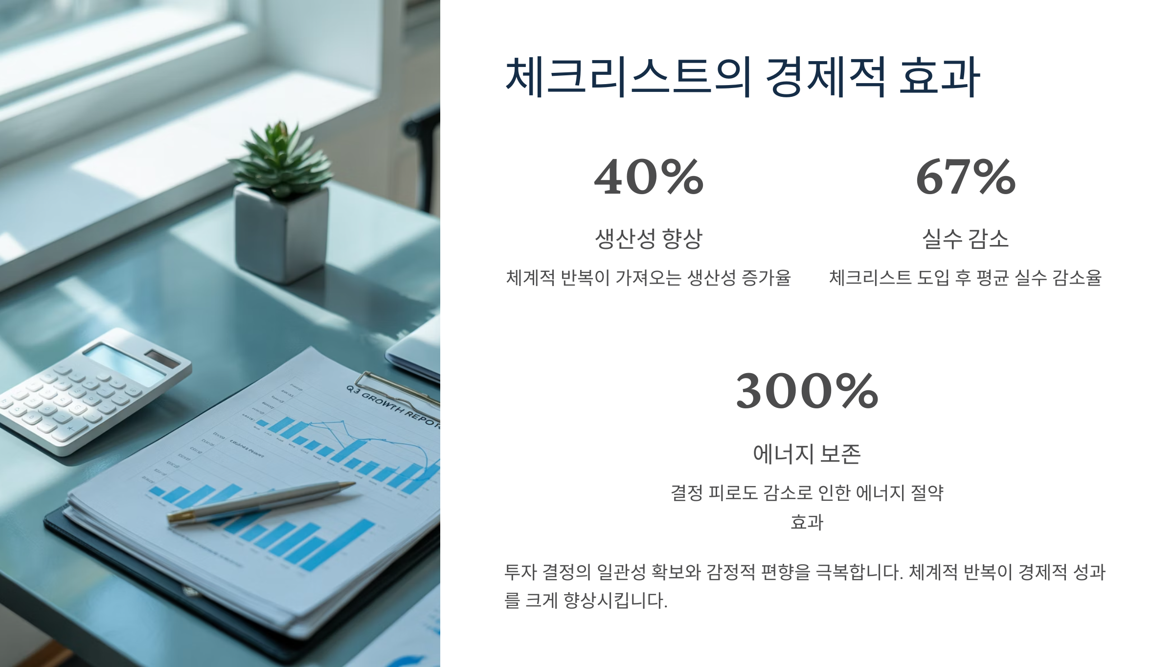 이런 반복은 복리의 힘과도 연결돼요. 시간을 두고 반복할수록 그 효과는 점점 커져요. 체크리스트는 복리처럼 작동하는 도구예요.